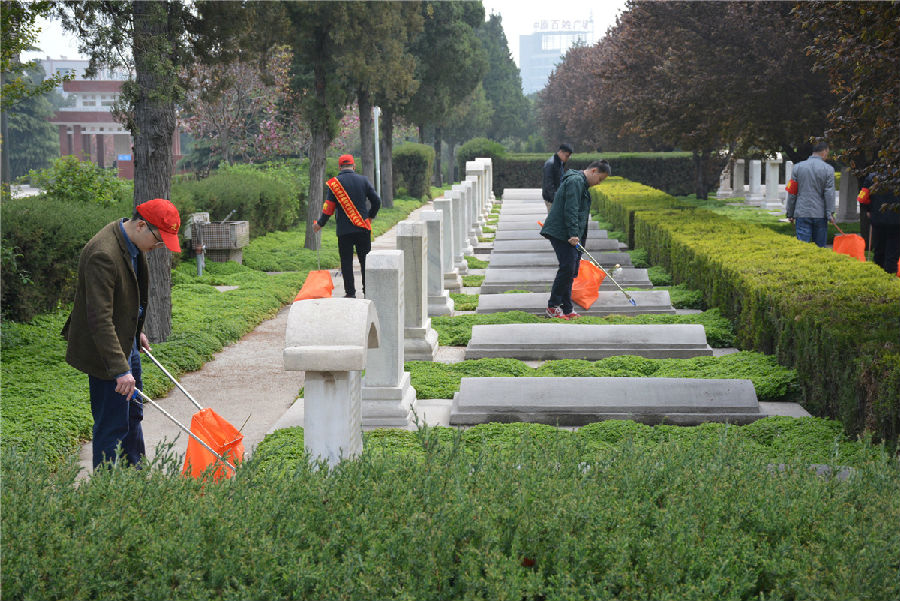 三、開展“倡議文明緬懷,減少廢棄污染”拾撿垃圾志愿服務活動。緬懷先烈活動結束后,市建投公司志愿者們在烈士陵園內開展“倡議文明緬懷,減少廢棄污染”拾撿垃圾志愿服務活動。每位志愿者都手持垃圾鉗,認真將散落在紀念碑前以及隱藏在雜草中的廢棄鮮花、飲料瓶、紙張等垃圾拾撿起來放入提前準備好的垃圾袋中。活動持續一個小時,志愿者們在祭奠先烈的同時以自己的實際行動表達崇敬之情,并倡導以獻一束花、敬一杯酒、植一棵樹、清掃墓碑等方式寄托哀思,將祭拜逝者的傳統習俗以更加環保、健康、安全、文明的方式表達,營造文明祭祀的良好氛圍。
